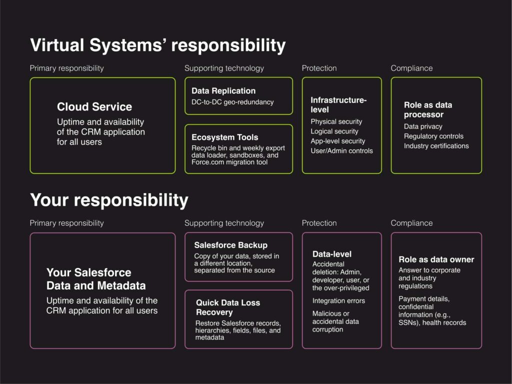 Salesforce keeps its services running, but you are responsible for managing the data that flows through them. VSystems uses the extremely reliable Veeam Backup for Salesforce in Veeam Data Cloud.